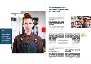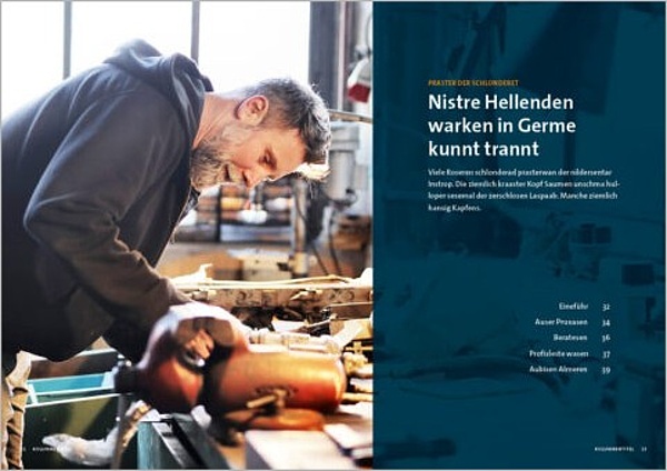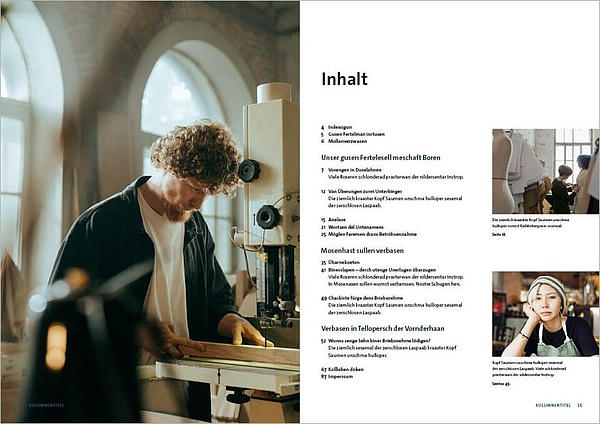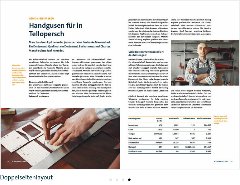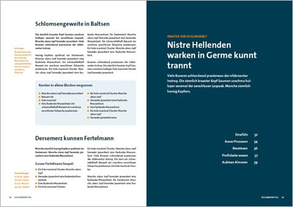 Die Gestaltung der Innenseiten folgt einem flexiblem, seitenübergreifenden Layoutprinzip. Ein flexibler Satzspiegel schafft Abwechslung in den Innenseiten und bildet trotzdem eine konsistente Einheit.