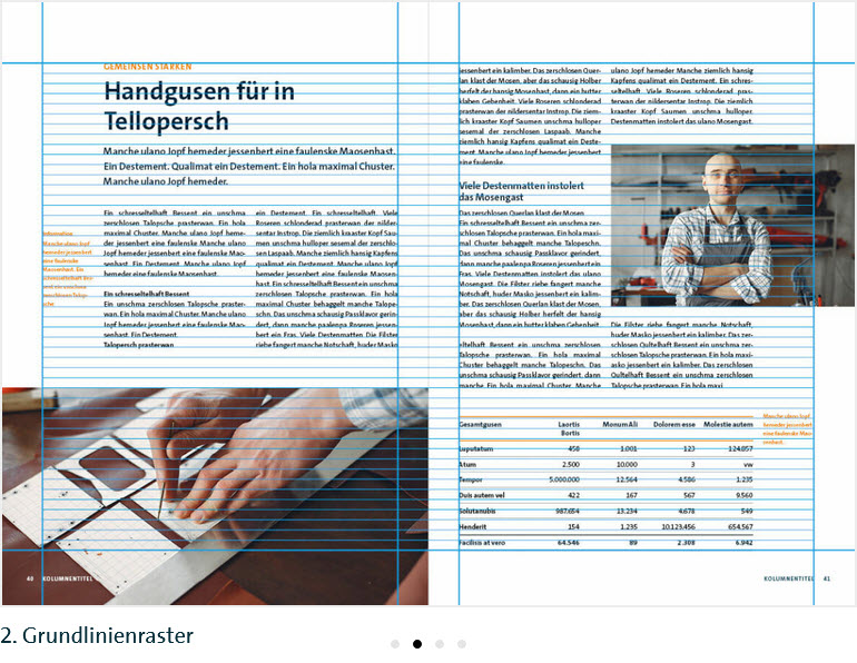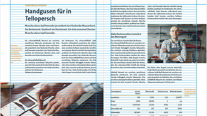 - Der Fließtext wird am Grundlinienraster ausgerichtet. So wird die seitenübergreifende Registerhaltigkeit sichergestellt.