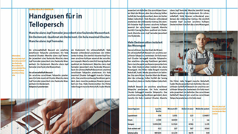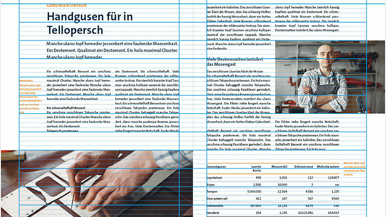Um eine broschürenübergreifende, konsistente Gestaltung zu gewährleisten, bietet ein System aus drei aufeinander aufbauenden Raster Orientierung beim Layouten.