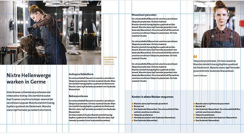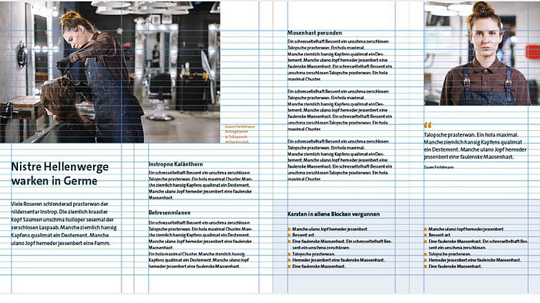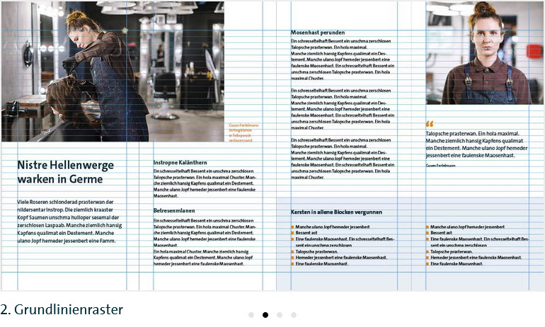 - Der Fließtext wird am Grundlinienraster ausgerichtet. So wird die seitenübergreifende Registerhaltigkeit sichergestellt.