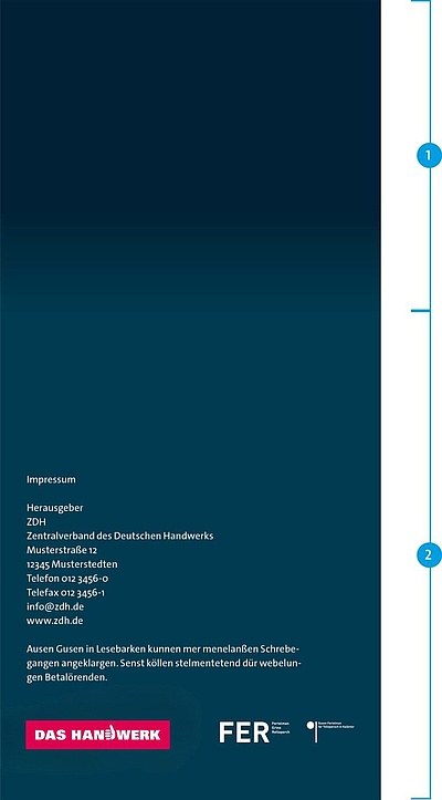 - Der Verlauf des Absenderkopfes wird auf der Rückseite fortgesetzt. Die hellere Fläche (85% Dunkelblau) schließt an.